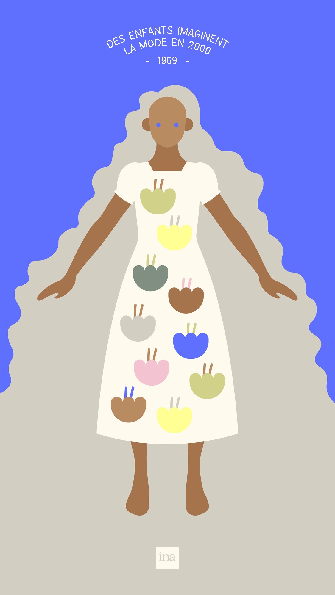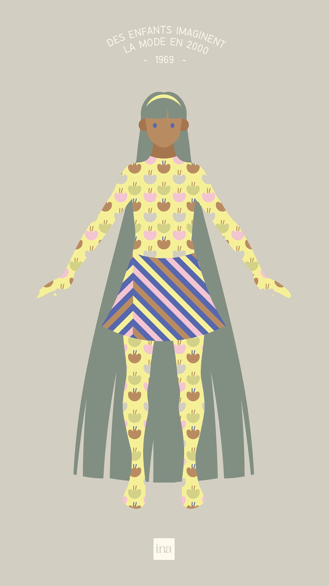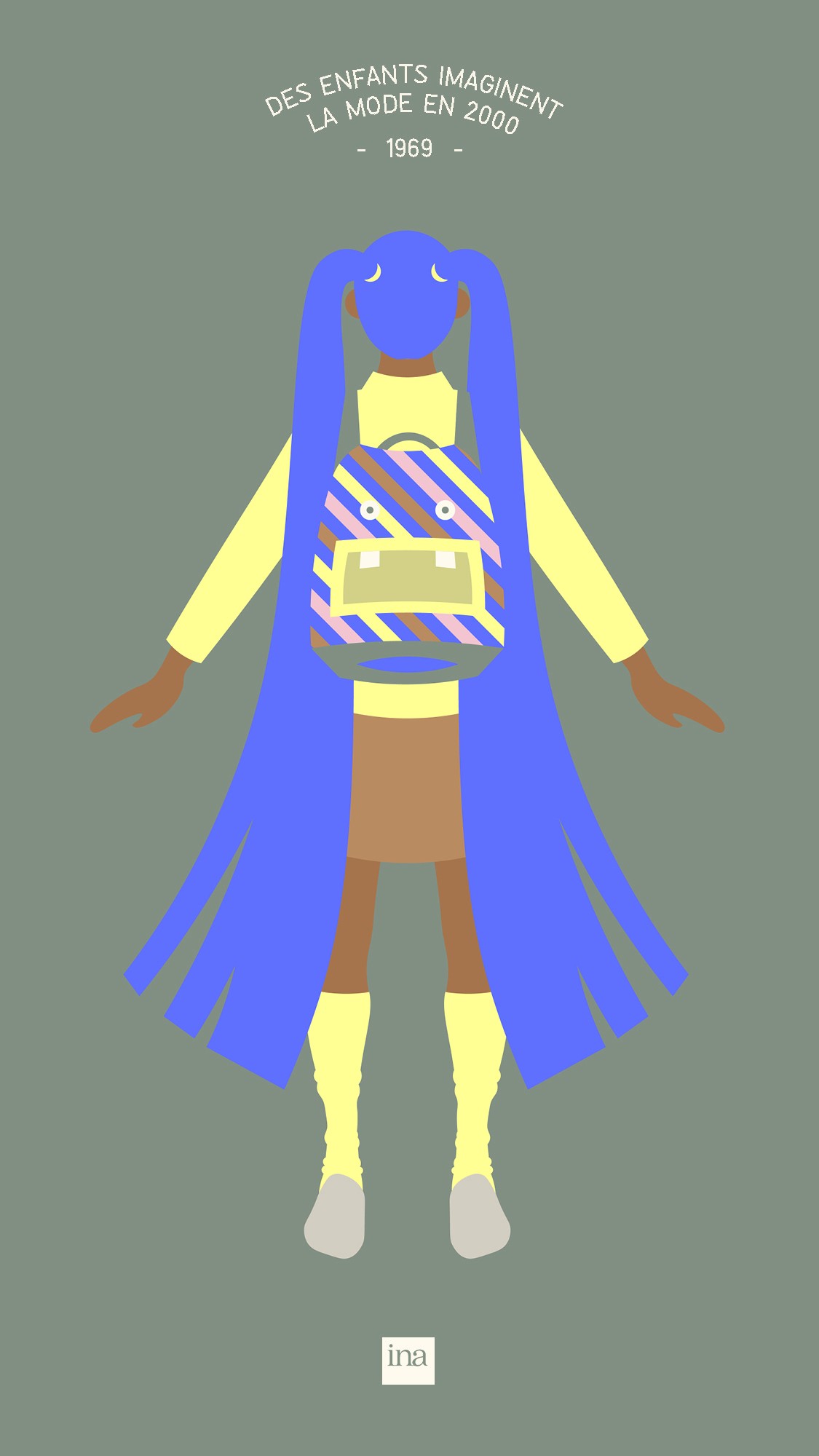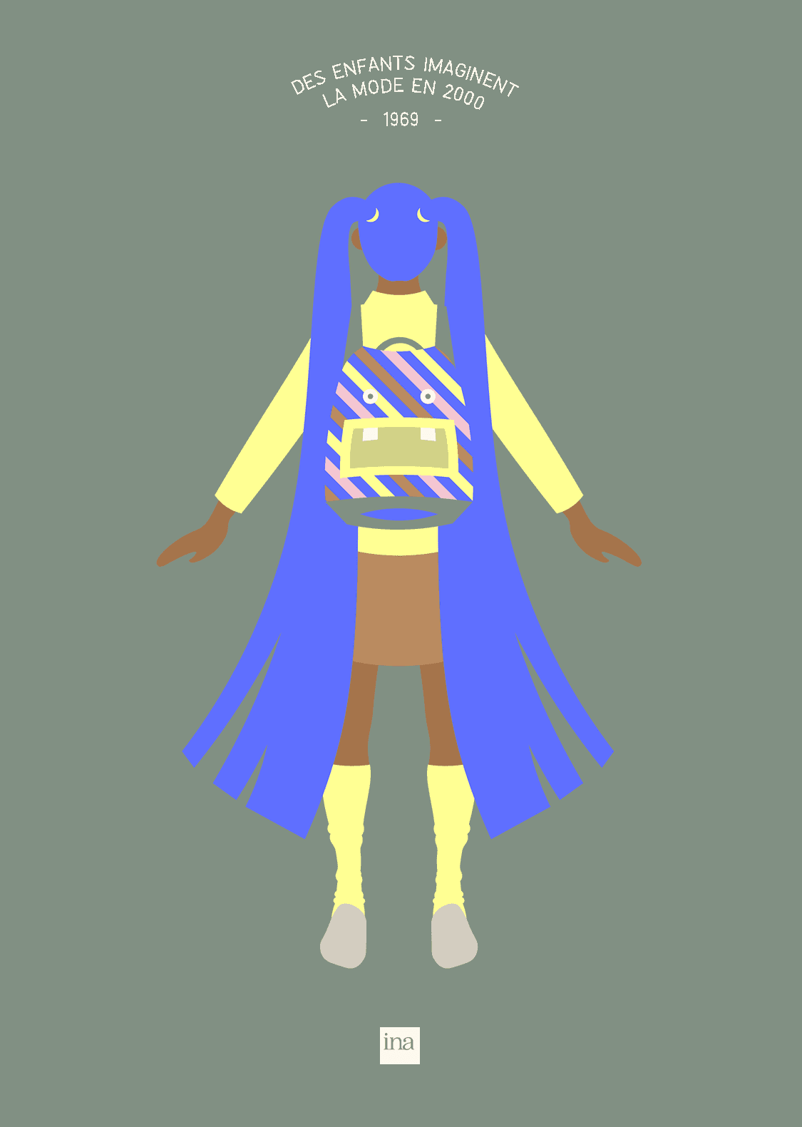 Création d'une courte vidéo afin d’illustrer une ancienne vidéo d’archive d’INA. On peut y voir de jeunes écoliers en 1969, décrivant comment ils voyaient la mode en l’an 2000. Ils parlent de très longues chevelures, de mini-jupes, de combinaisons en collant etc. Les couleurs pop, les aplats et les formes simples ramènent à l’enfance et à des notions comme l’innocence et la créativité.